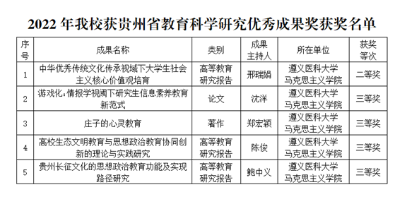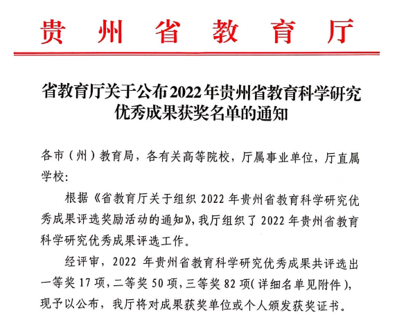 近日,贵州省教育厅发布了《关于公布2022年贵州省教育科学研究优秀成果奖名单的通知》,公司共有5项成果获奖,均为必一运动教师获得。其中,二等奖1项,三等奖4项,获奖数量位居全省高校第四名,蝉联我省医学类高校第一名。
