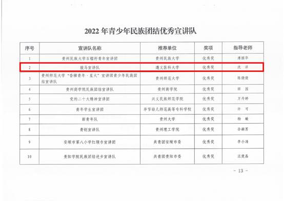 近日,贵州省民族宗教事务委员会、省教育厅、团省委正式公布全省2022年青少年民族团结优秀宣讲队评选结果(共评选10支),公司必一运动硕士生导师沈洋副教授指导的“骏马”宣讲队成功入选,是遵义市唯一一支获此殊荣的队伍,体现公司思想政治教育专业研究生的培养水平,展现公司师生理论宣讲所取得的显著成效。