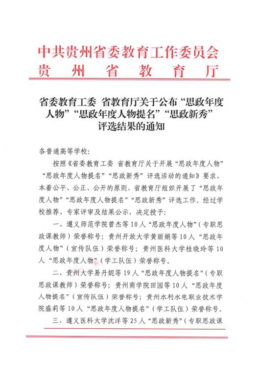 10月31日,贵州省委教育工委、省教育厅正式印发《省委教育工委 省教育厅关于公布“思政年度人物”“思政年度人物提名”“思政新秀”评选结果的通知》(以下简称“通知”),公司教师唐瑶和沈洋分别入选“思政年度人物提名”(专职思政课教师)和“思政新秀”(专职思政课教师)。同时,思想政治教育专业导师王纪鹏和张在金分别入选“思政年度人物”(宣传队伍)和“思政新秀”(宣传队伍)。此外,公司员工工作部(处)谢国秀老师入选“思政年度人物”(学工队伍)。